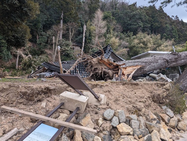 樹齢100年を超えるような松の木が倒れ、神社が下敷きになっているという状況でした。